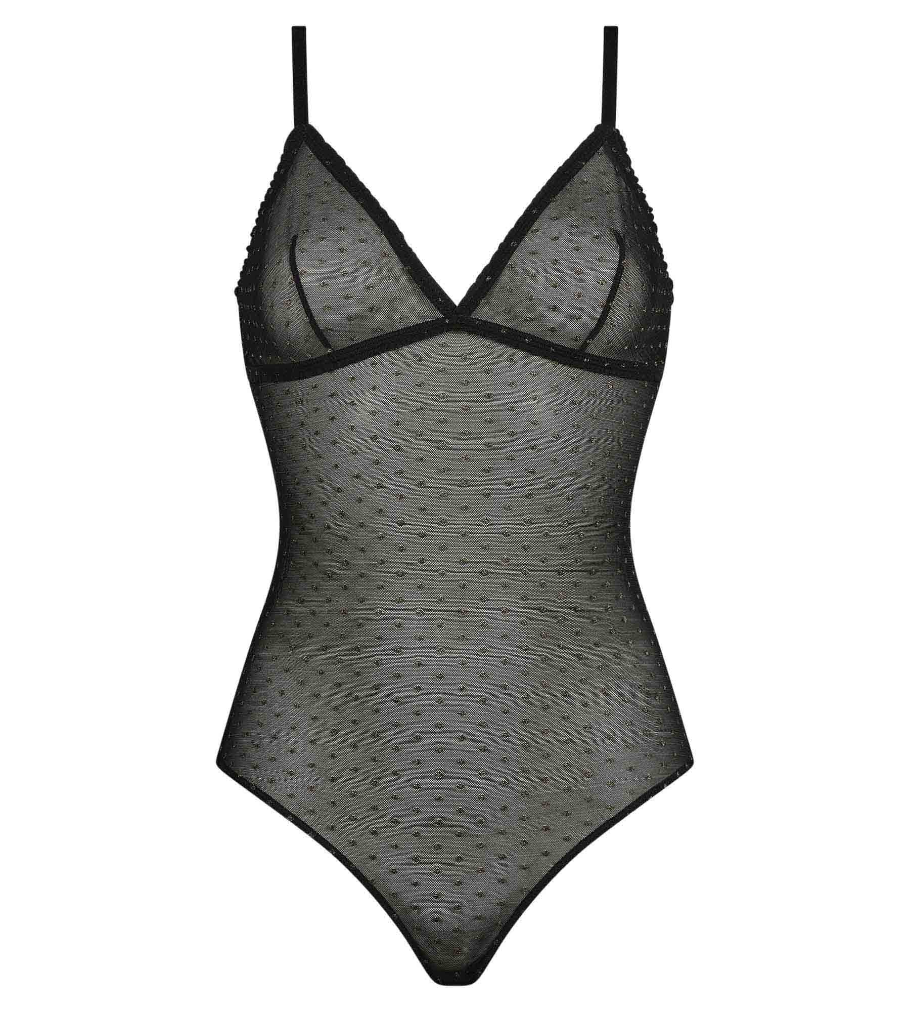 Slip into the feminine Dim Shiny Mesh bodysuit in translucent voile with a slim fit! Thanks to its triangle bra Integrated, with lined cups and elastic under the bust, the Dim bodysuit emphasises your bust with softness and femininity. We love the lurex polka dots, ruffled hem and satin straps, they're ultra glamorous! Wear by day under an office blazer, or by night as a trendy top, the body underwear Black Shiny Mesh is your new favourite fashion accessory!