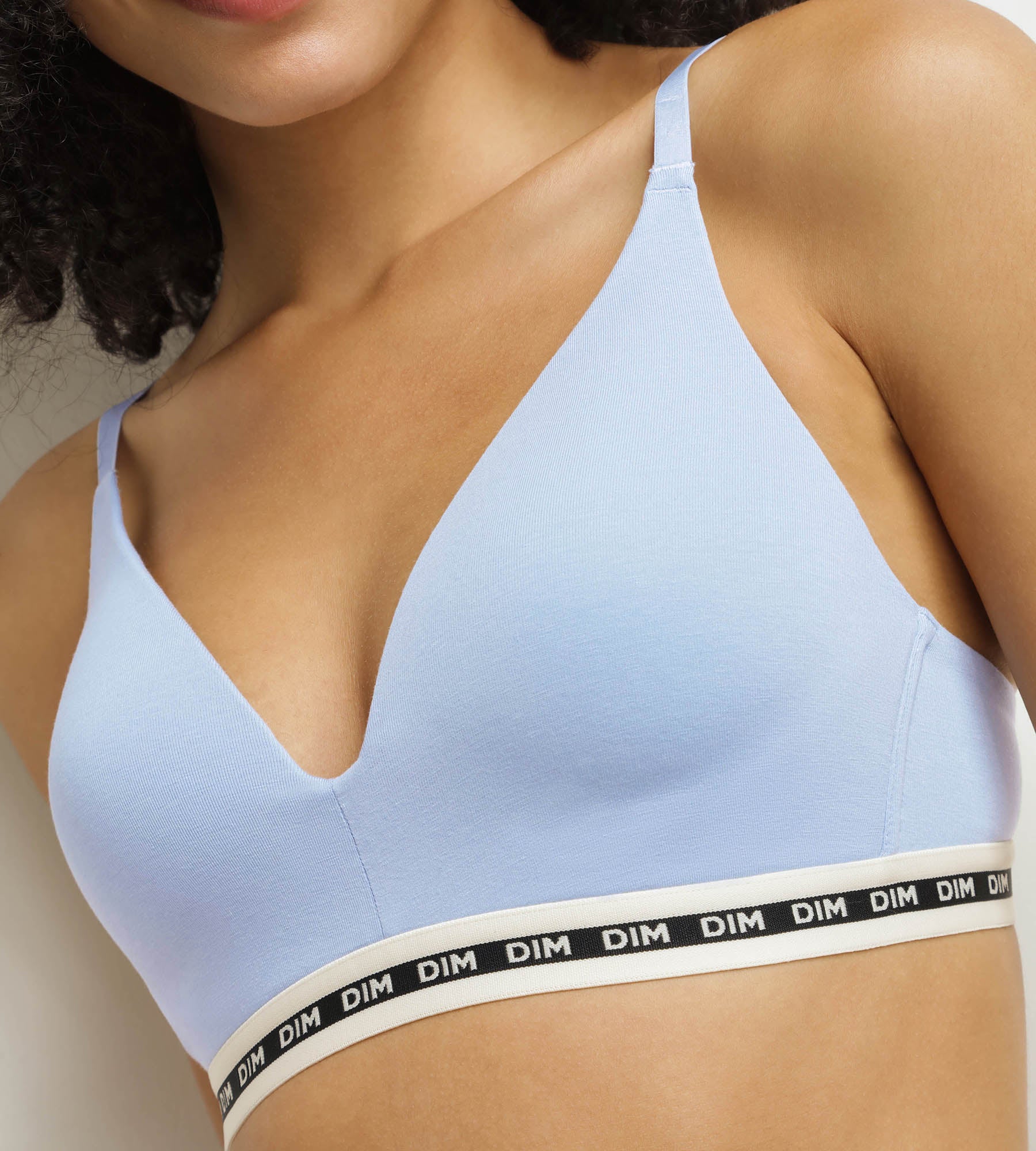 Designed in comfortable modal cotton with supple cups, the Dim Icons Essentiel wire-free bra guarantees natural, non-compressive support. With its plunging neckline and logoed bottom, the Dim Icons Essentiel triangle bra subtly enhances the décolleté and soberly emphasizes the silhouette.