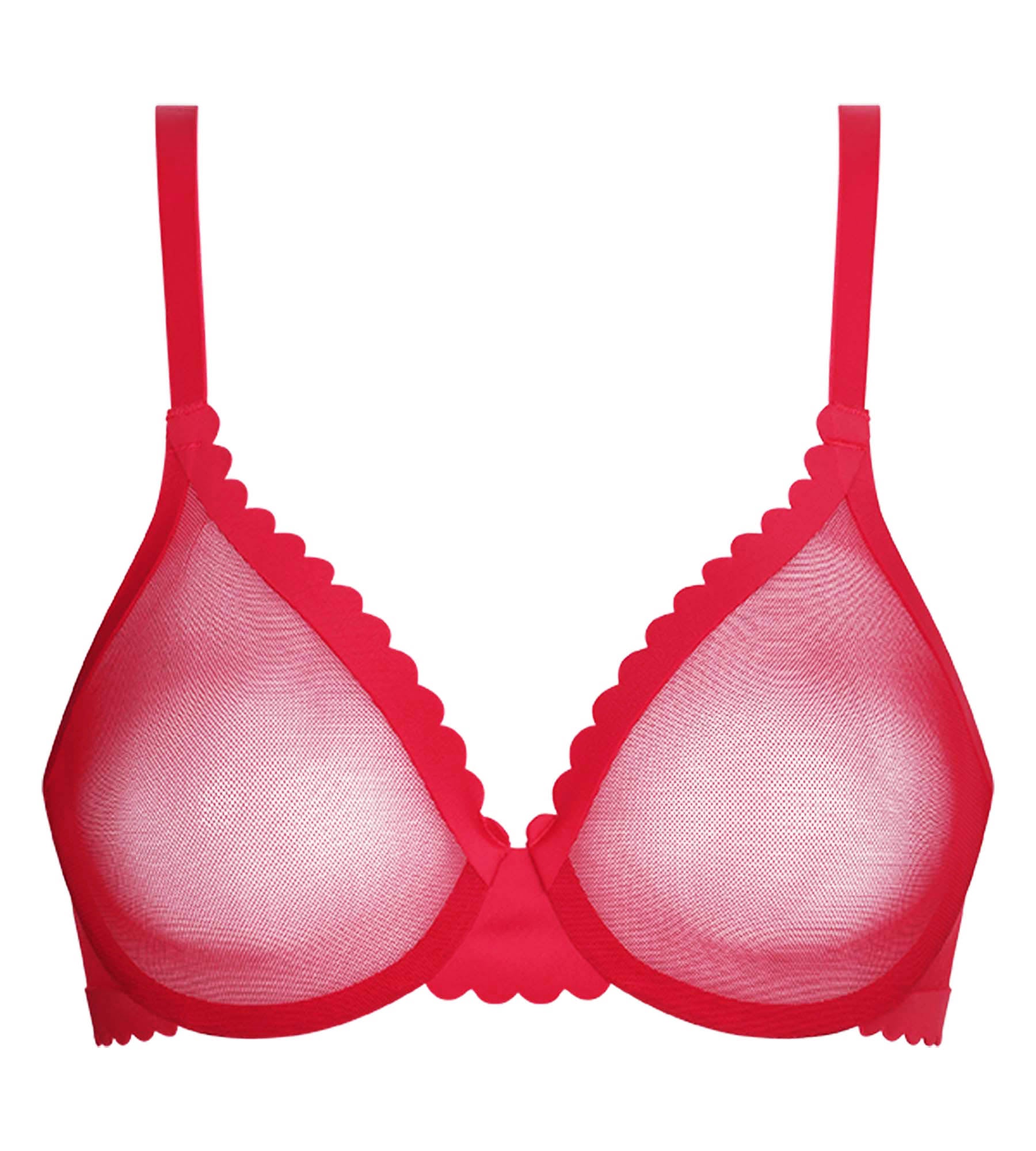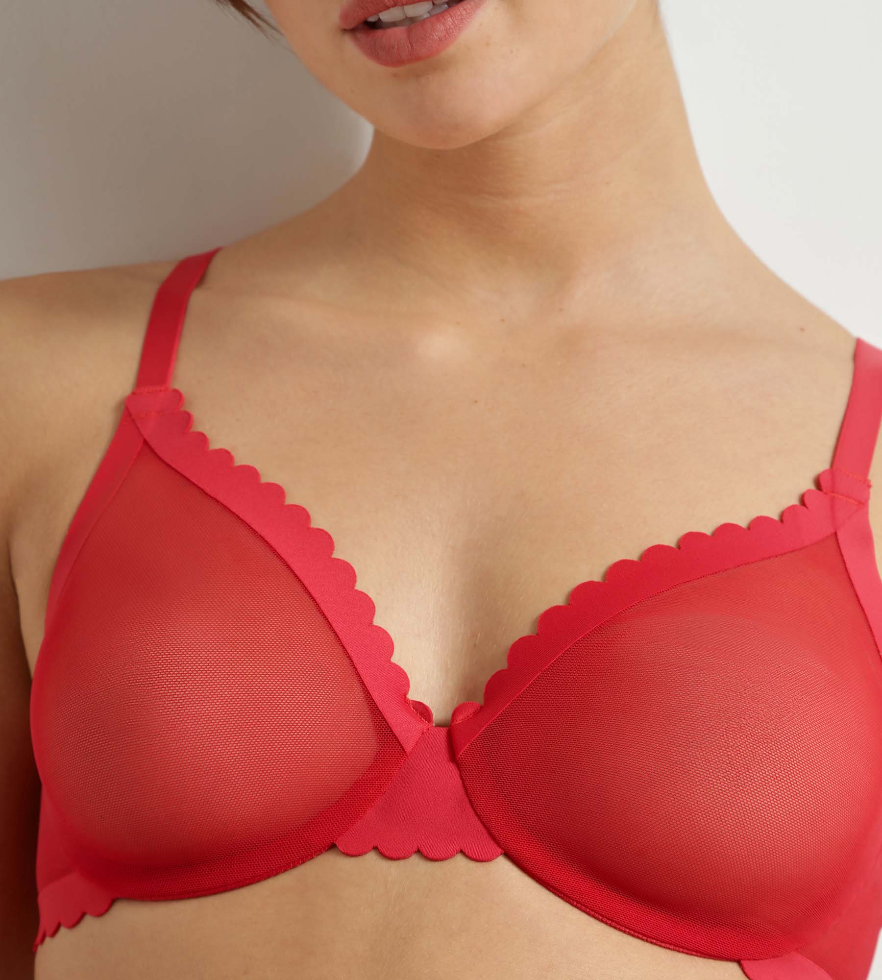 Fall in love with the Dim Body Touch Cheeky demi bra in transparent Rouge Valentin tulle, your ally for support and femininity!