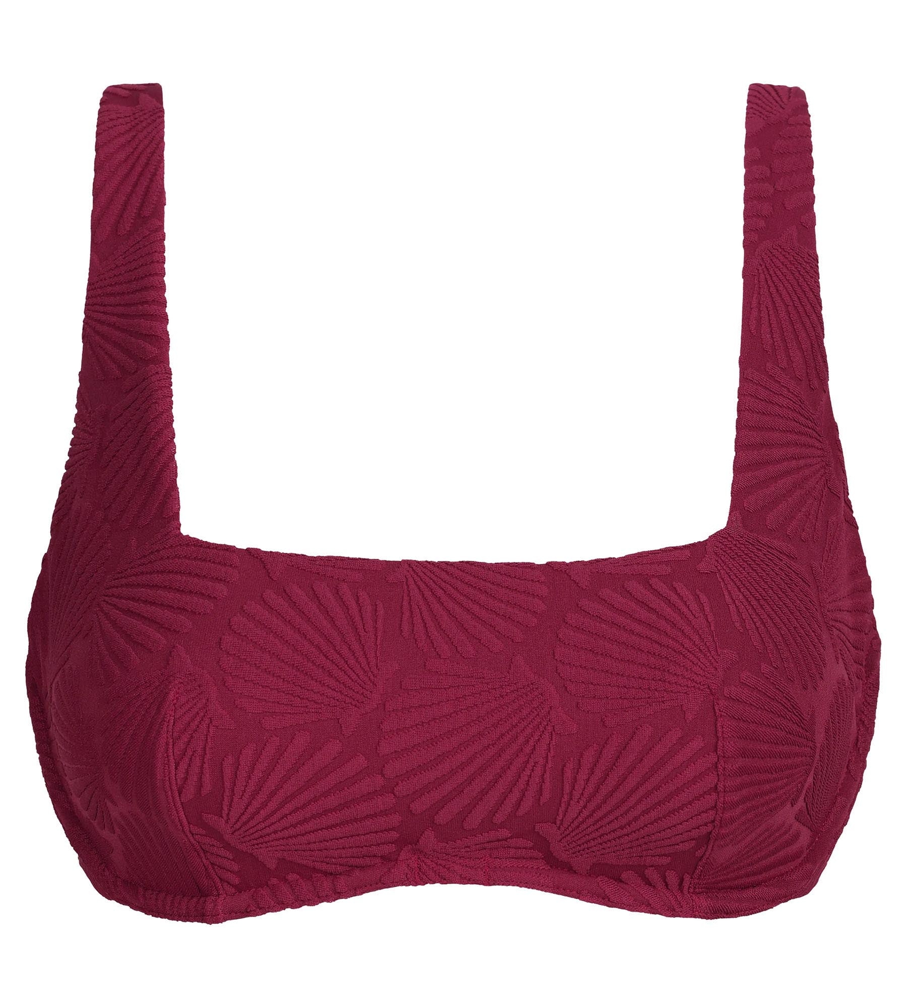 With a square neckline, intense red colour and shell motif, the Dim Swimwear bra-style swimsuit top offers graphic style and elegant support.