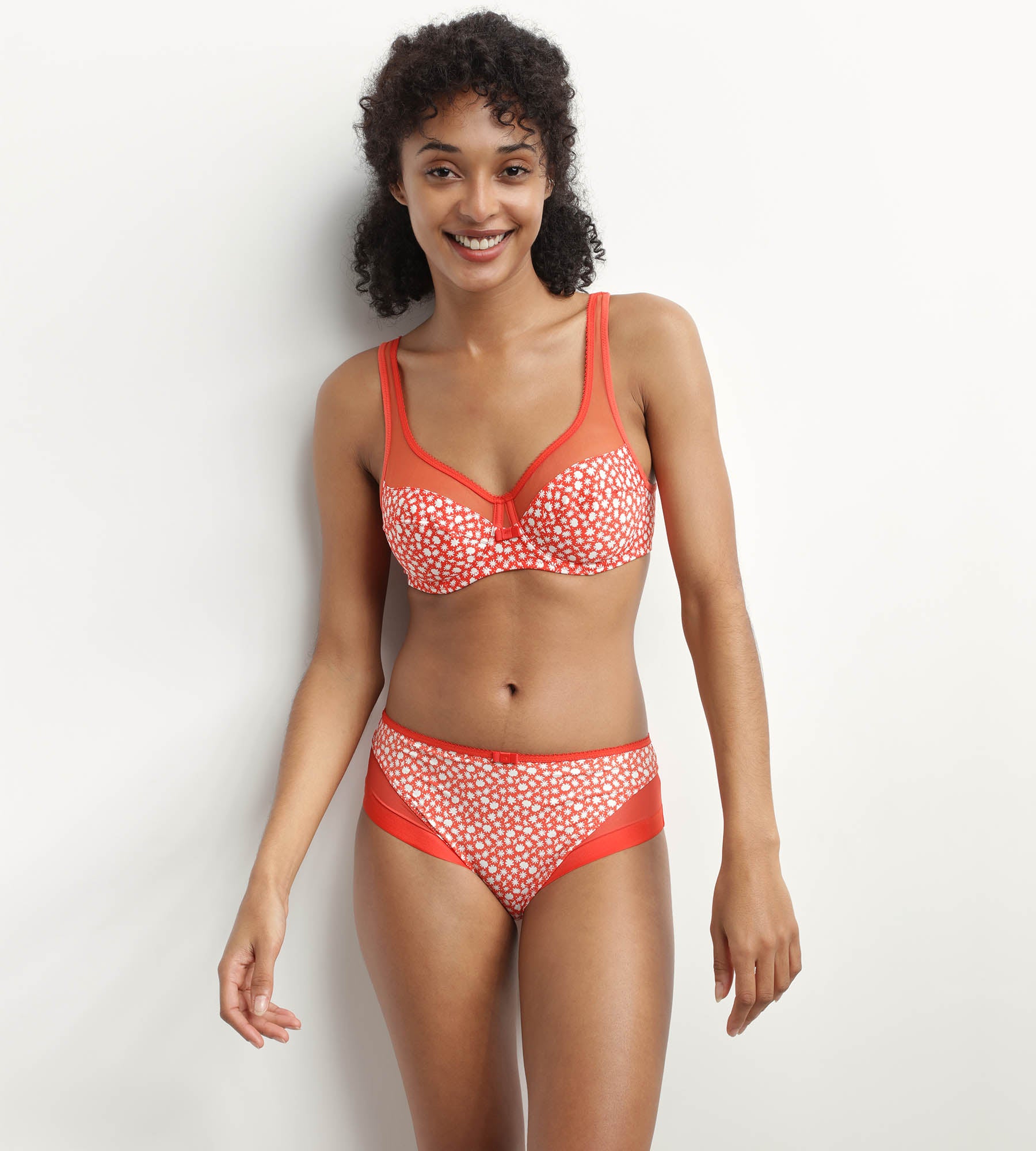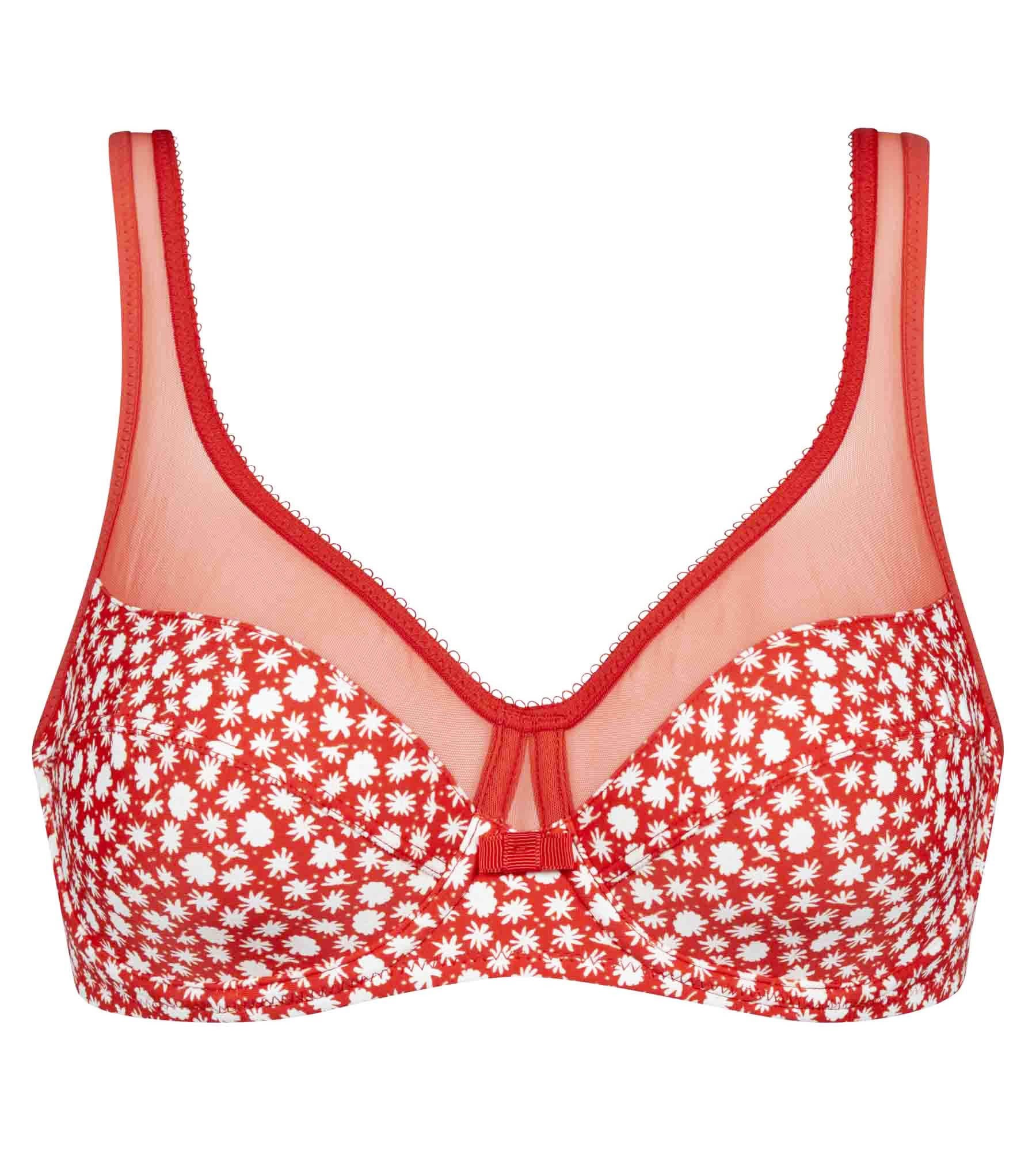 Combine comfort and femininity with the Dim Generous Wireless bra in Red microfibre with flowers and transparent tulle!