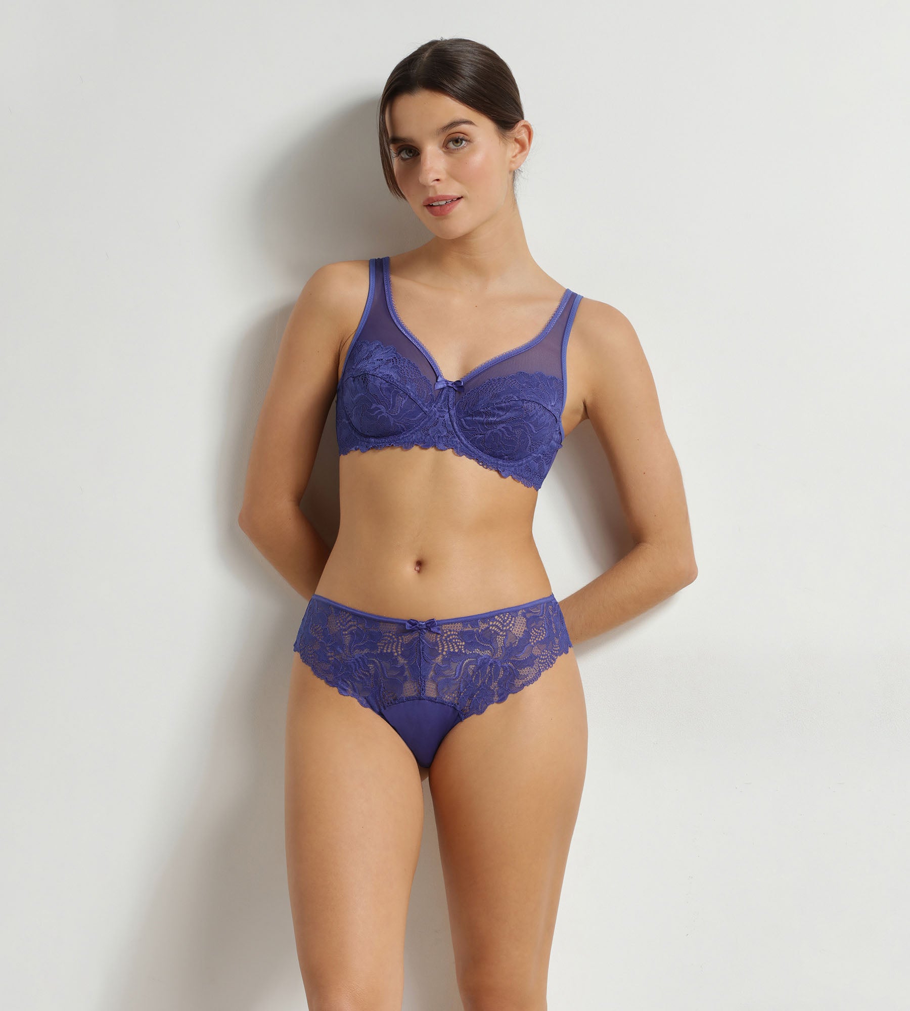 The Generous Essentiel blue bra by Dim combines comfort and femininity in a shade with purple highlights, easy to wear every day. The deep lined cups provide optimal support up to an E cup, while the lace and tulle create a sheer effect for an elegant look without excess.