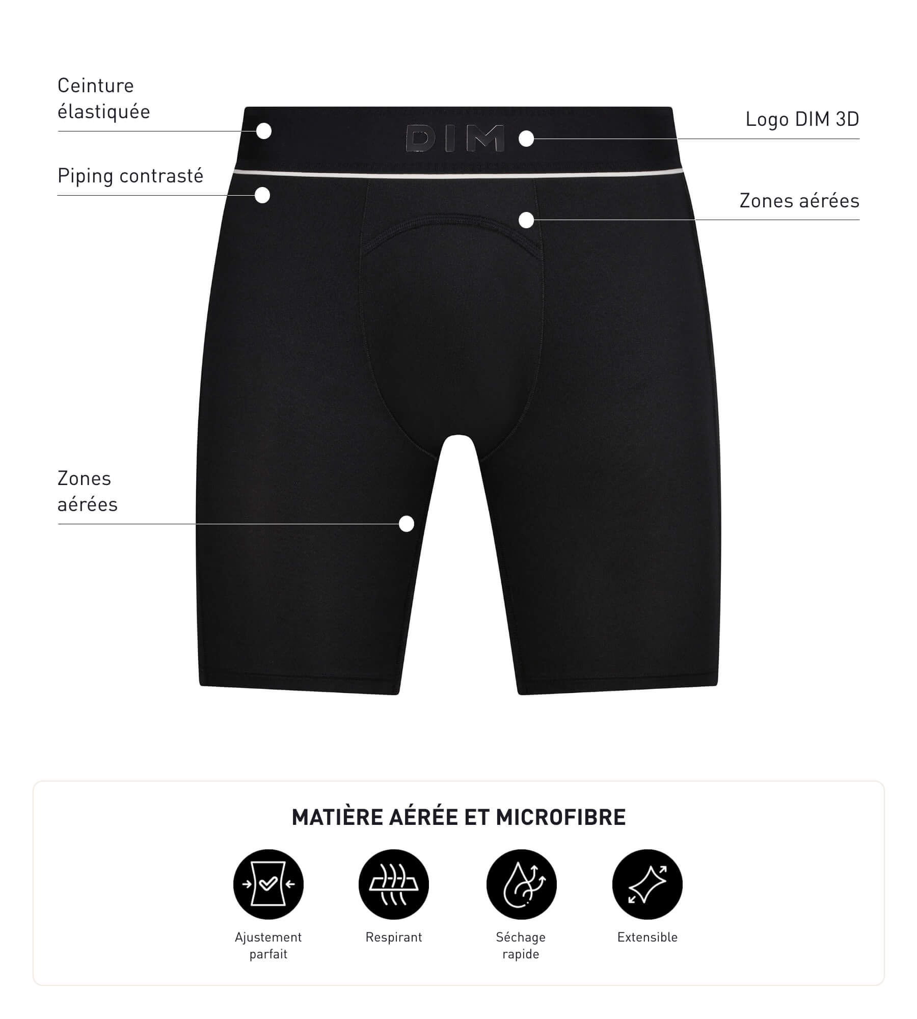 Adopt the versatile, technical design of the Dim Move Black Men's Long Boxer Brief, which can be worn on its own or under your sportswear! Made from stretch microfibre with a lining at the front, the boxer briefs men's sports Shapes and supports your body to perfection, like a second skin. With ventilation zones in the crotch and back, this Dim Move sportswear guarantees a cool feeling throughout your activity.