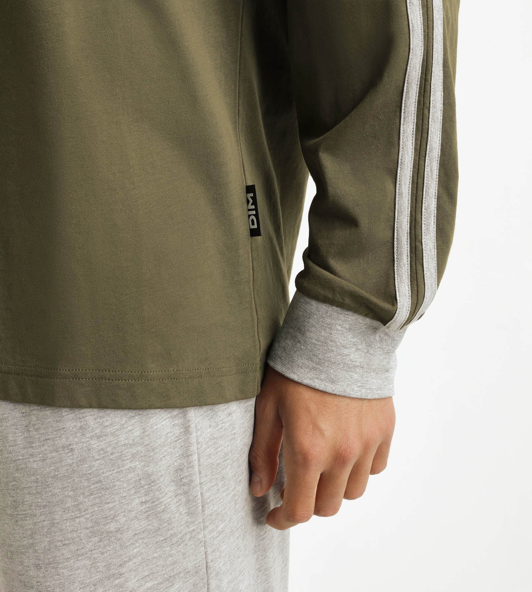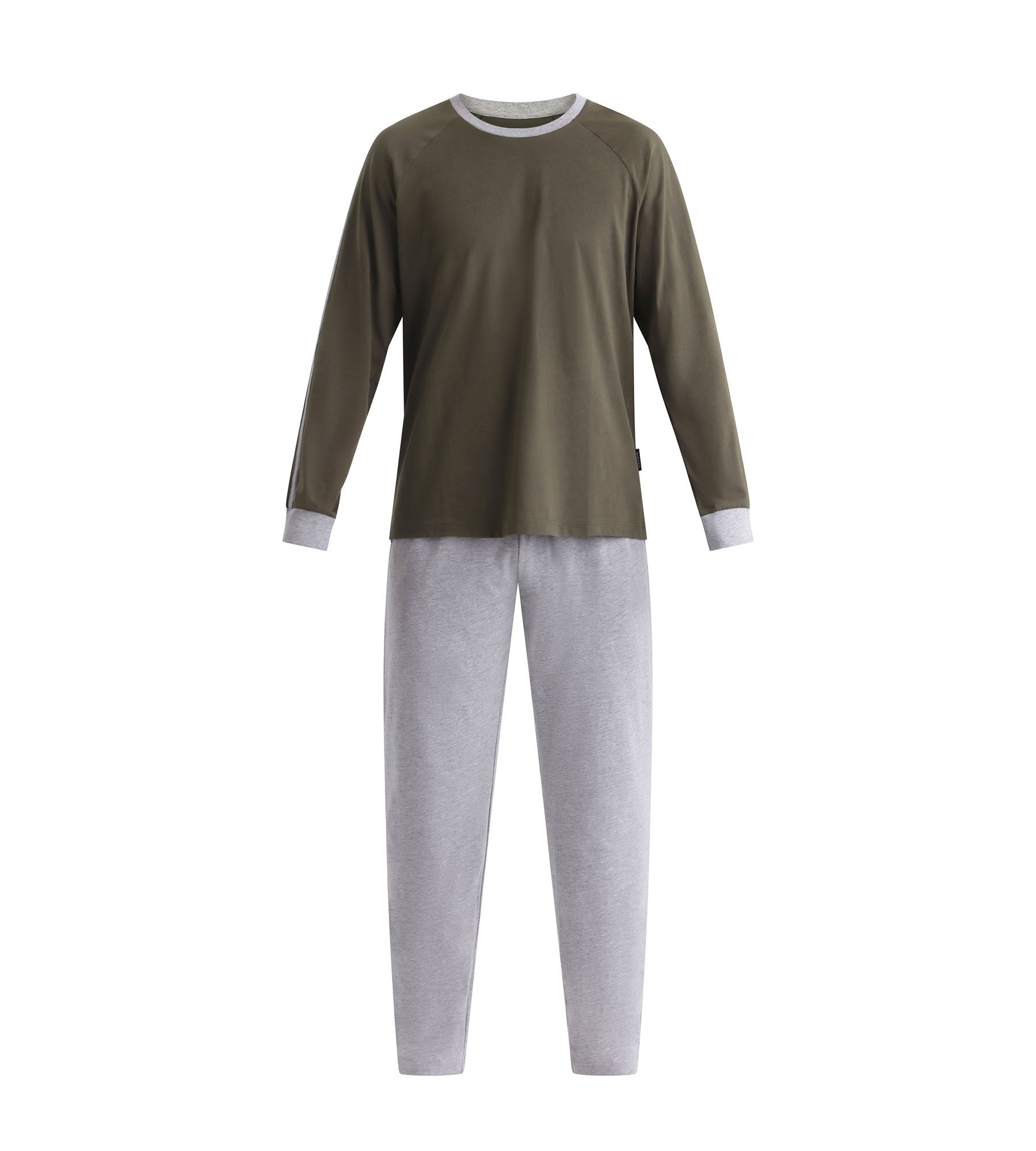 These Dim Jersey men's pyjamas combine simplicity and effectiveness. The long-sleeved khaki top, accented with stripes and a mottled grey collar, adds a sporty touch to your set without overdoing it. The matching straight trousers in mottled grey are sober and comfortable, thanks to their stretch waistband. The Pack offers good freedom of movement and a soft feel, perfect for relaxing moments or quiet nights.