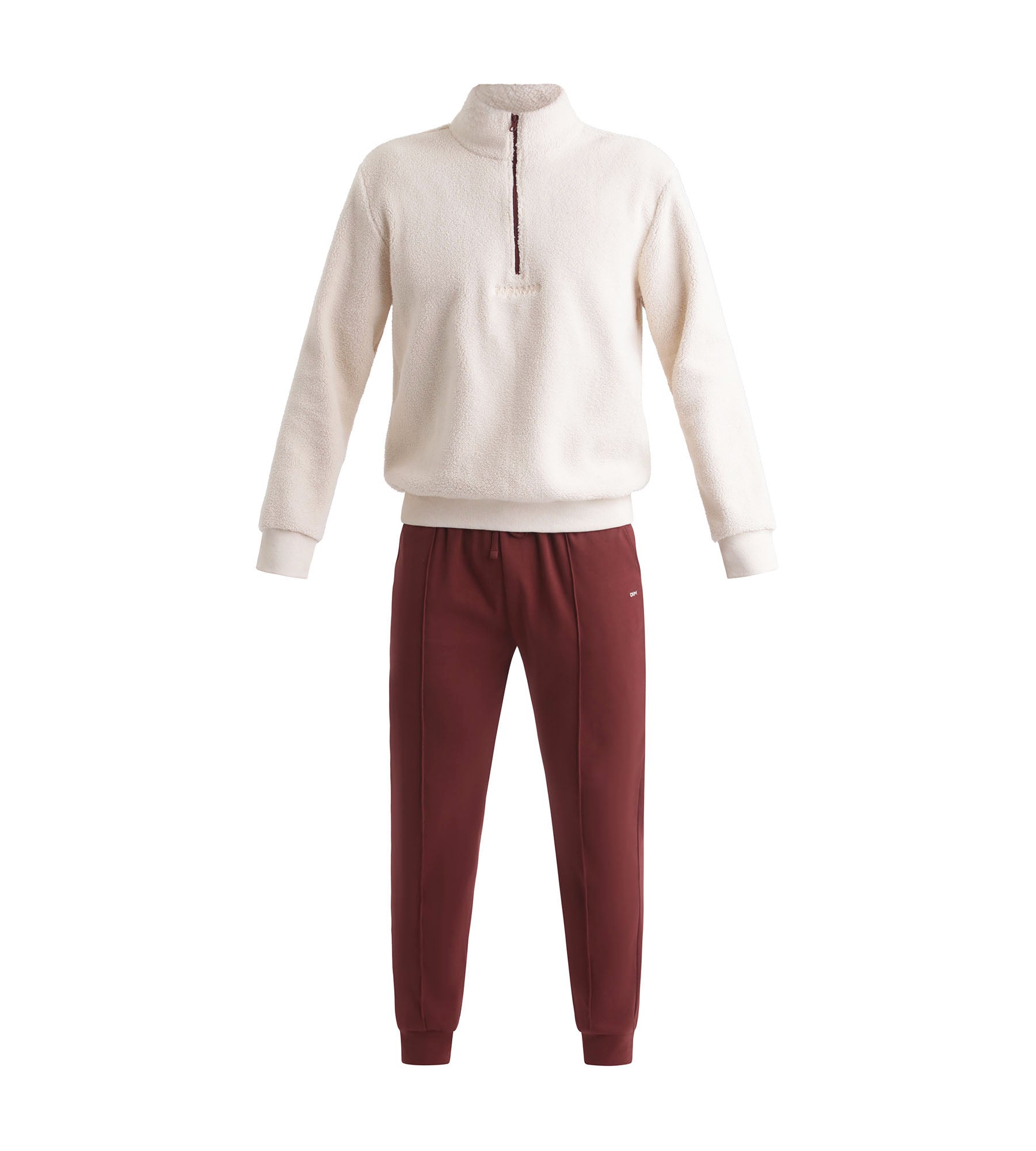 For a cosy, urban style, opt for Dim's men's trouser pyjamas in ivory and burgundy lambswool effect.