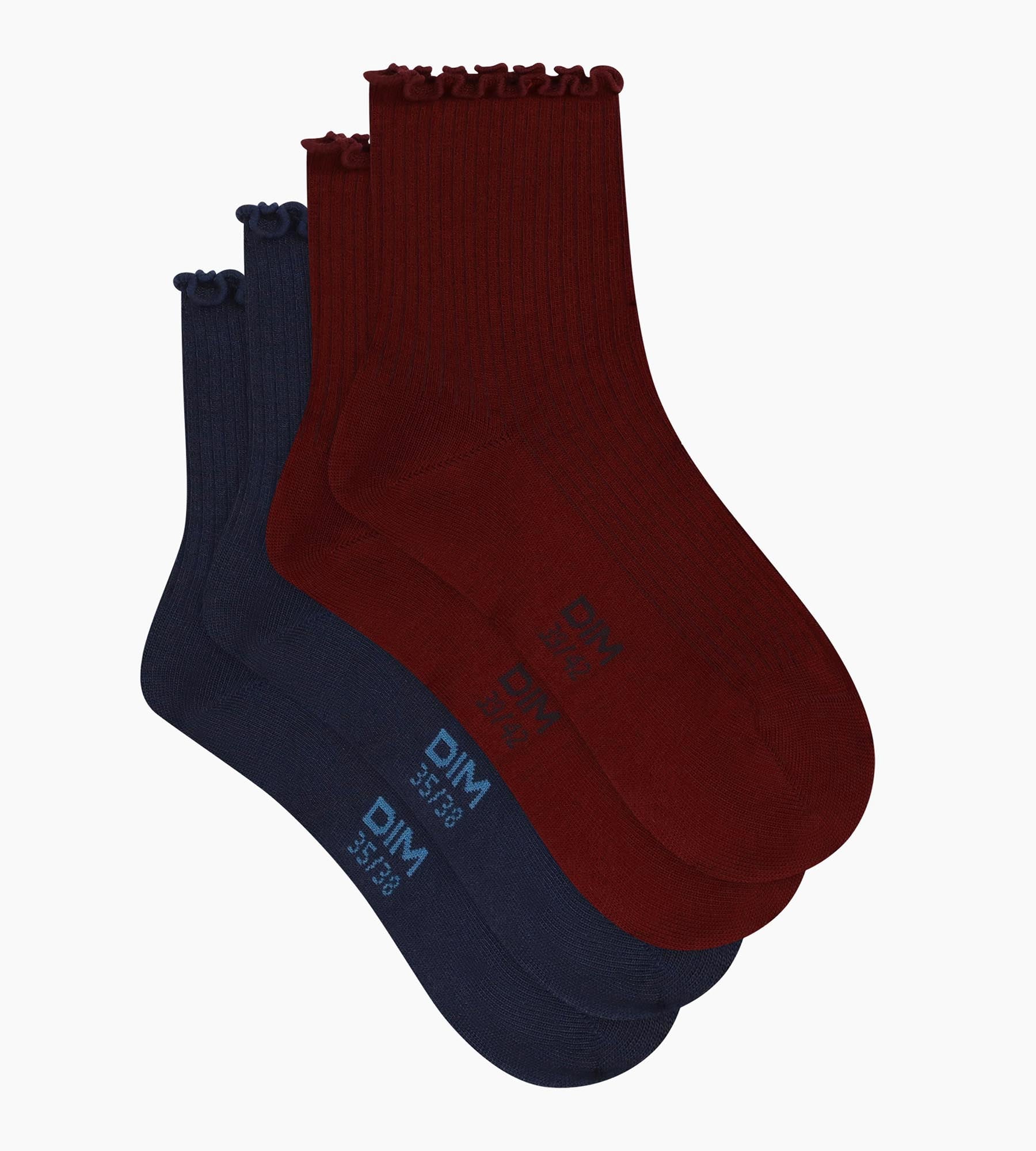 This pack of 2 pairs of women’s socks features bold colours and discreet couture details to add energy to your everyday wardrobe. The cotton-modal blend is soft and fluid to the touch, perfect in the spirit of Dim Modal. The wavy edge, visible just enough under rolled-up jeans or with a midi skirt and loafers, adds a fashionable dimension to this pack. Navy for a classic style, burgundy for a bolder touch: a subtle alternative to plain cotton women’s socks, with a confident fashion twist.