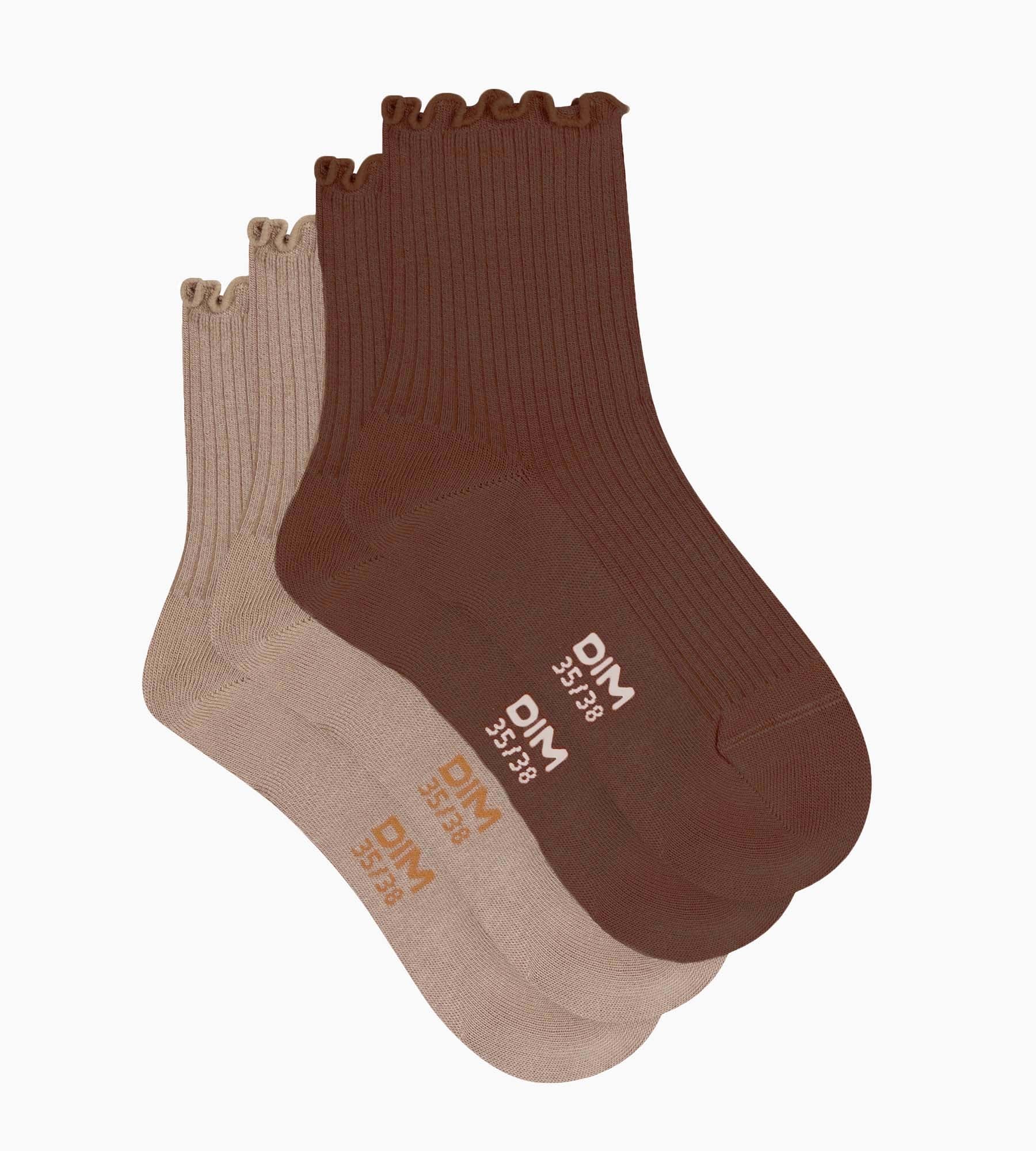 Add a warm, feminine touch to your outfits with this pack of 2 pairs of Dim women’s socks in taupe/cappuccino modal cotton with a delicate scalloped edge.