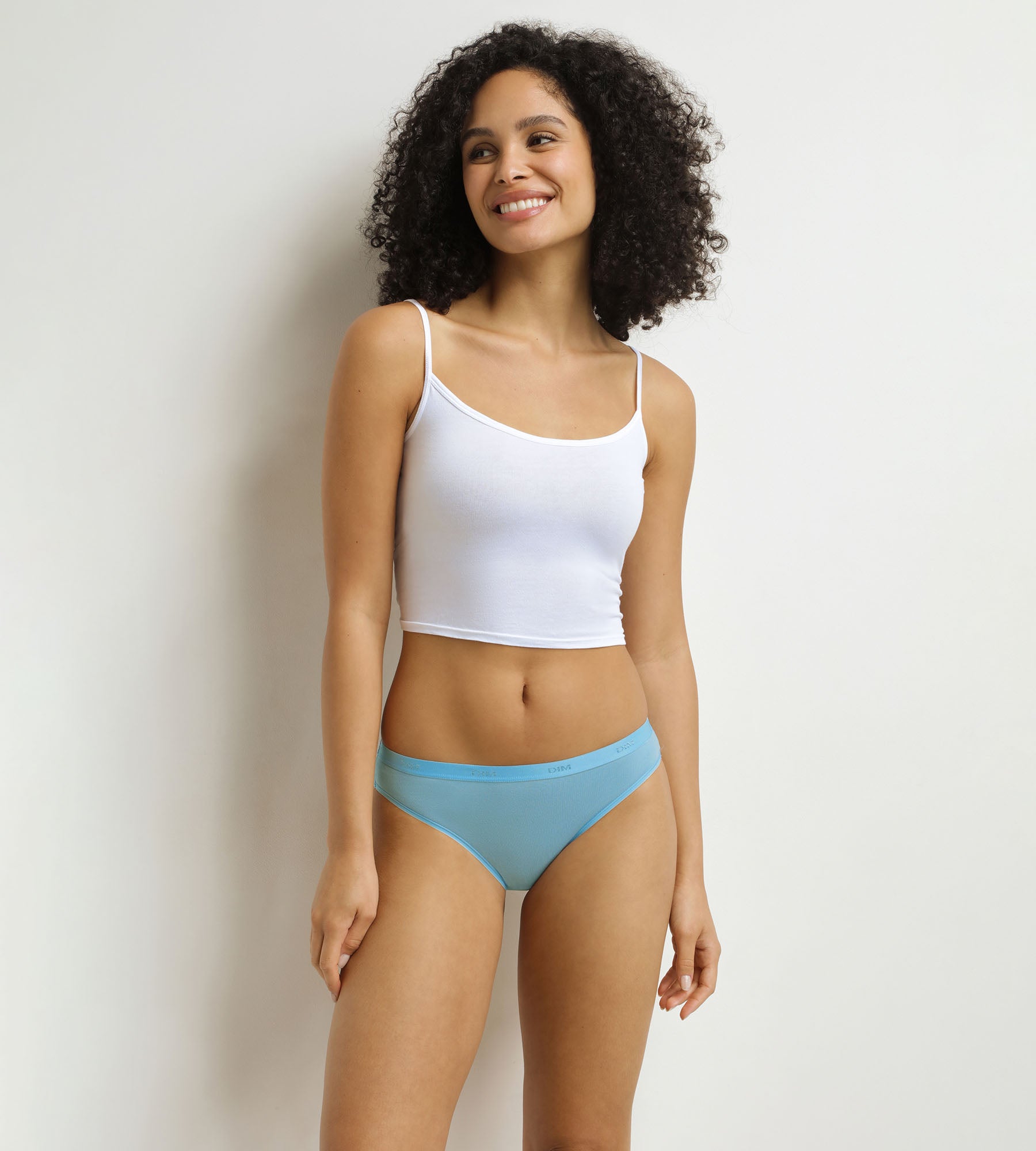 - The tone-on-tone satin waistband with Dim logo, for a neat touch