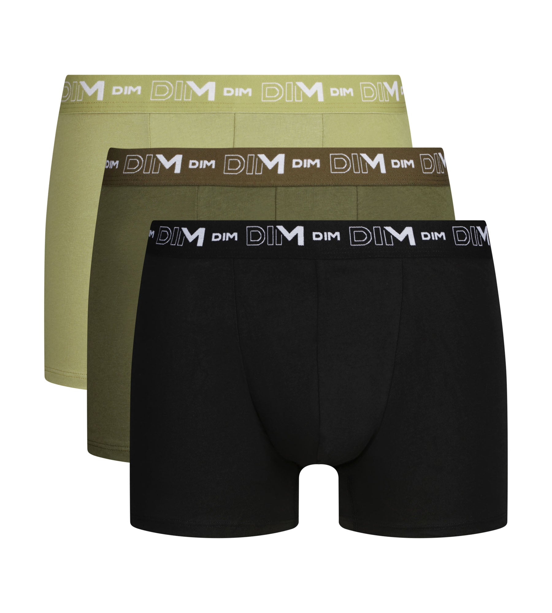 Featuring a trio of bold colours and a special comfort design, this pack of 3 Dim Stretch Cotton boxer shorts for men will appeal to men looking for comfortable and stylish underwear. Made from stretch cotton, these men’s boxer shorts offer natural flexibility that moves with you throughout the day. The fitted cut ensures optimal freedom of movement, while the front lining provides just the right amount of support. The Military version adds character, the Sand boxer shorts warm up the pack, and the Black boxer shorts offer a timeless base. The contrasting waistband with its Dim logo adds a modern and neat touch to this pack.