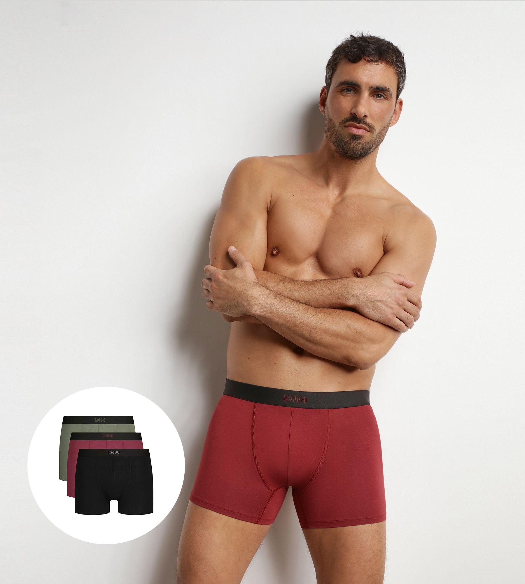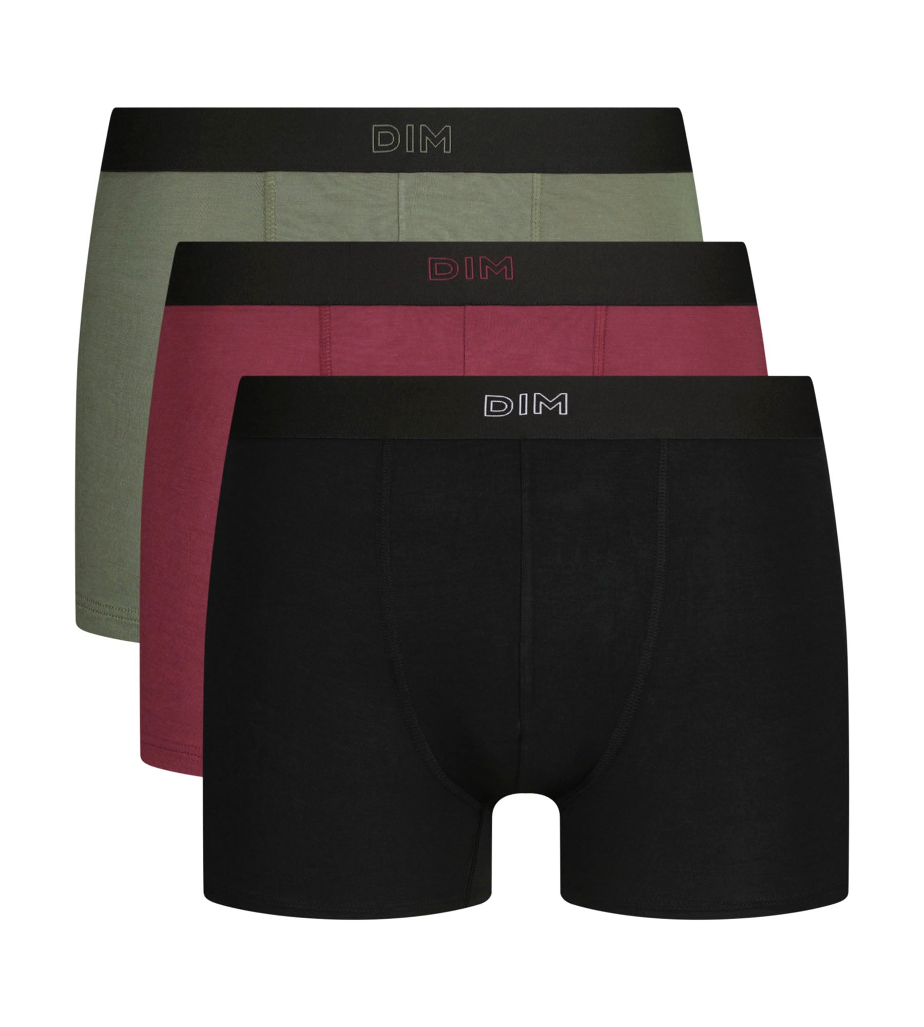 Enhance your everyday comfort with the pack of 3 Dim Pur Confort men’s boxer shorts in Black, Khaki and Red, essentials that combine support and style.