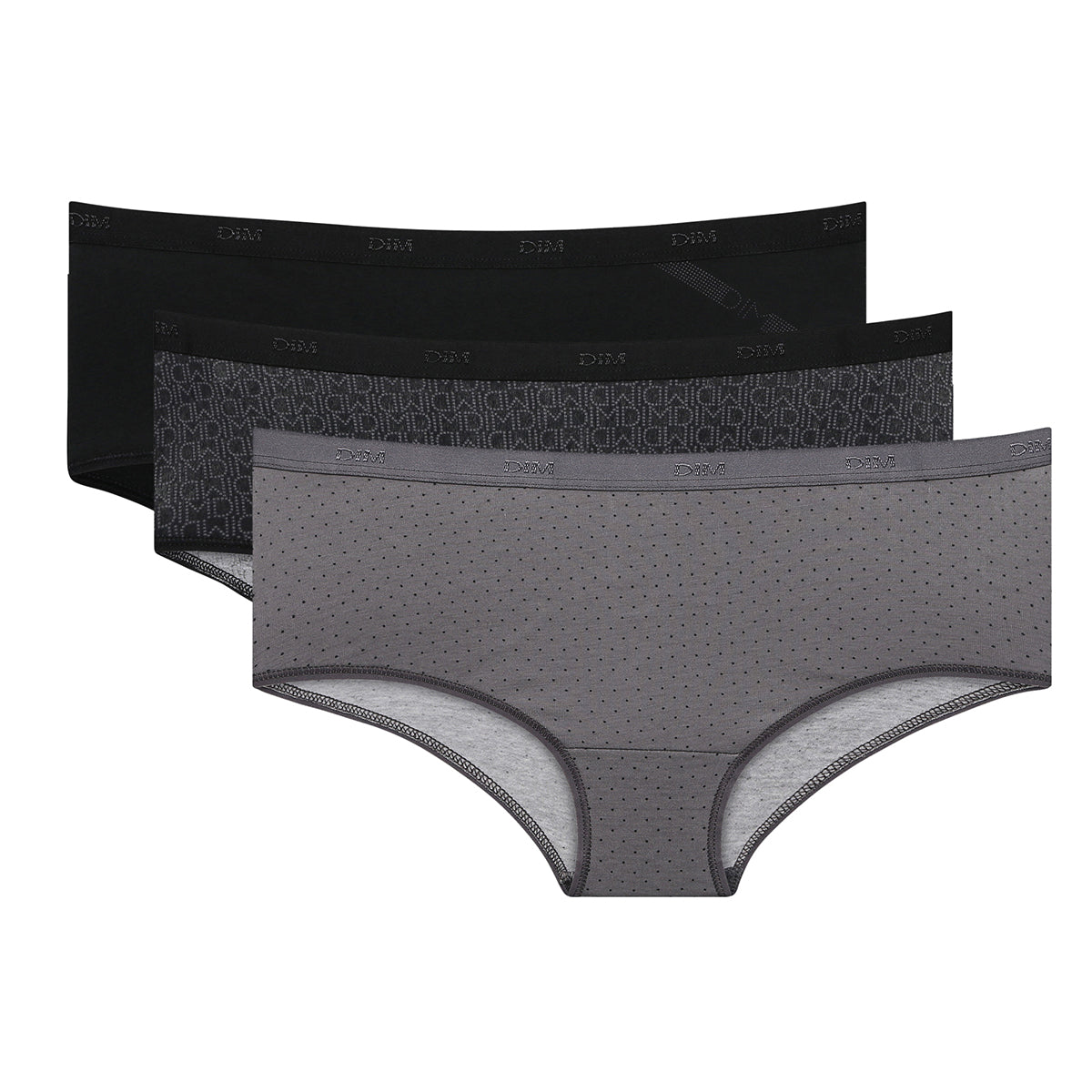 Trio of cotton boyshorts in black and grey with fashion print.