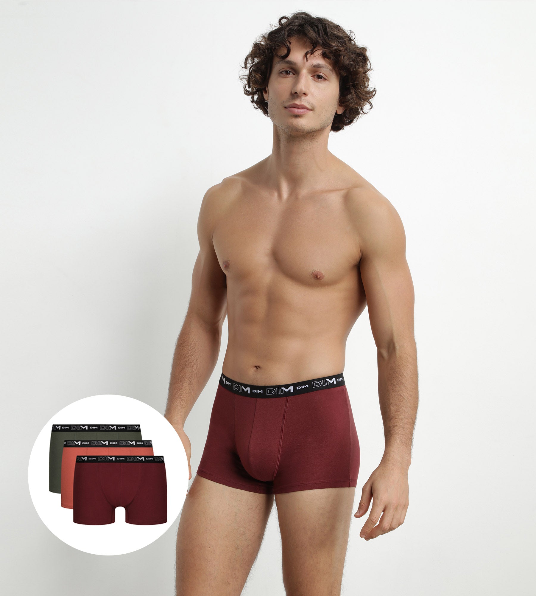 Rock your lingerie with the Dim Coton Stretch 3-pack of men's boxers in red and tennis green, with 3D waistband!