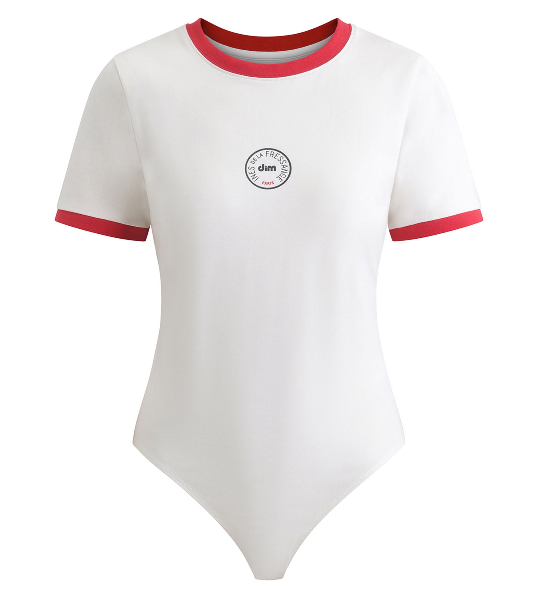 Adopt a sporty chic style with the Dim x Ines de La Fressange Nacre women's bodysuit, twisted with a contrasting red collar.