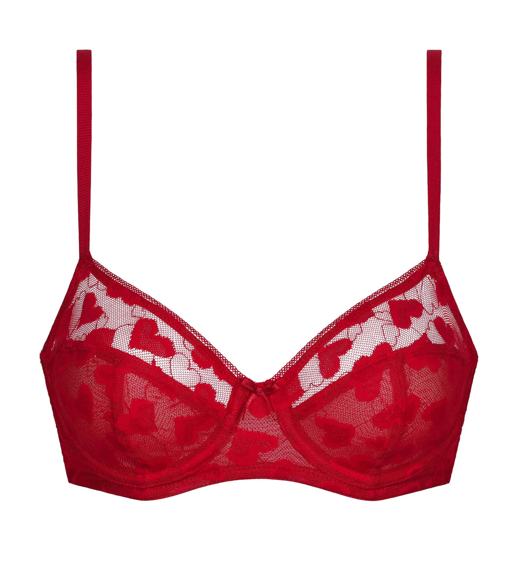 Embrace the unique style of the Dim Coeur interlocking bra with its red tulle and charming heart print.