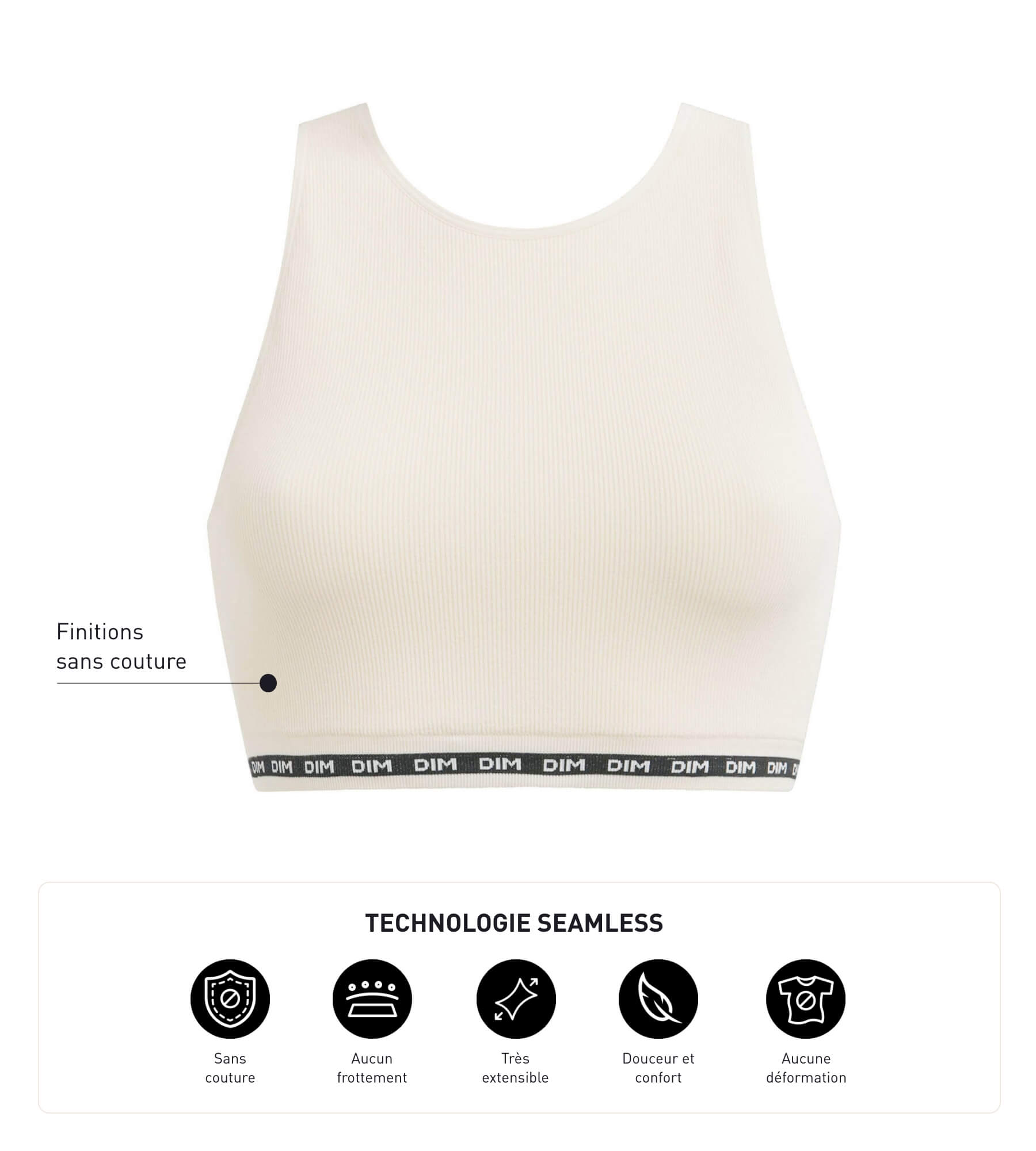 Tackle the day in comfort thanks to the Dim Icons Seamless bra, with a crop top cut seamless, which preserves your freedom of movement! We love its ribbed knit which wraps you with ease, and its supple structure: our dim brassiere bra is absolutely Cosy! Thanks to its cut like a top, our piece of lingerie can be worn alone or in addition to an invisible bra for more support.
