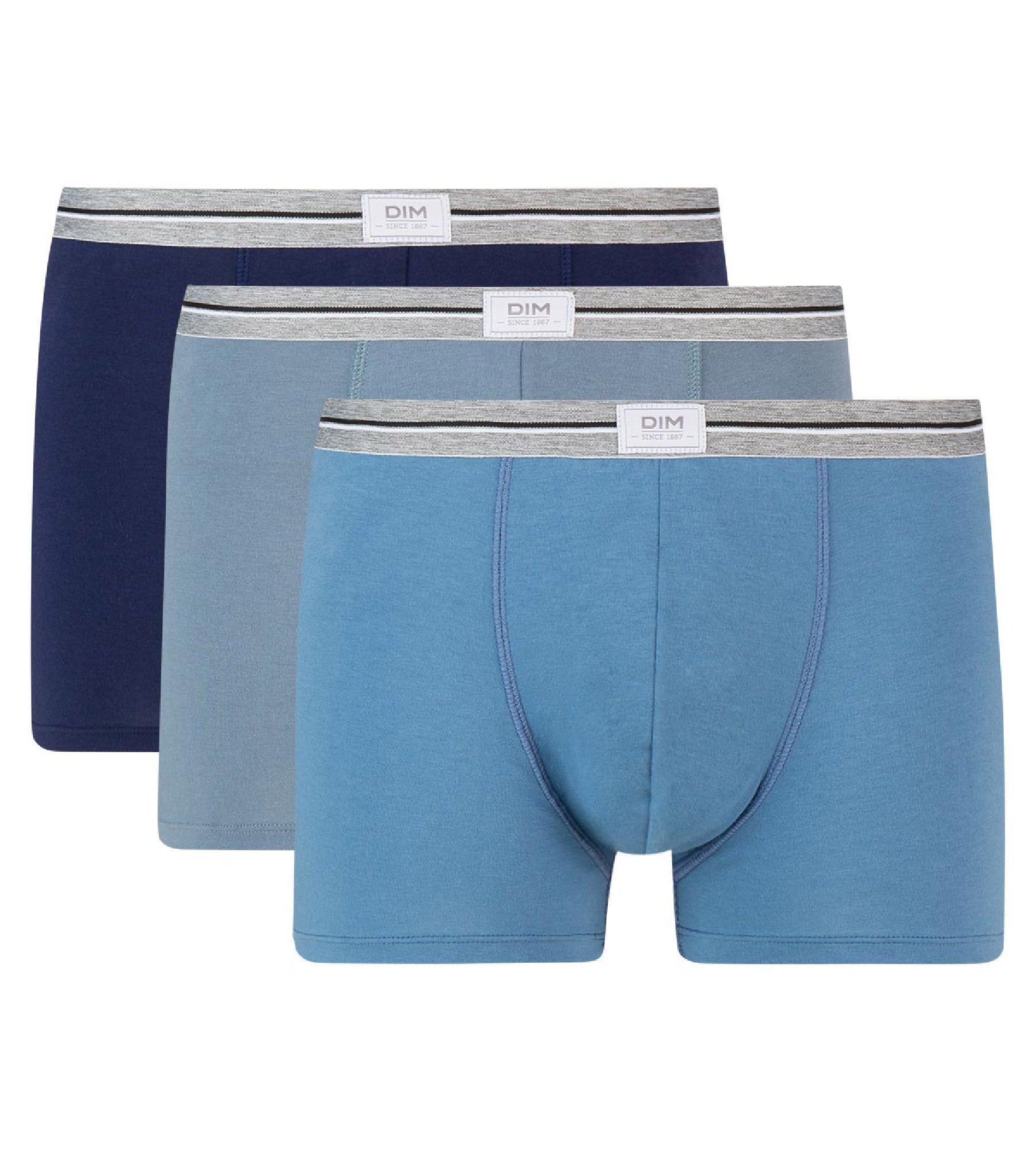 A slightly retro style, but 100% modern, durable and comfortable! These Ultra Resist men's trunks are characterized by their charismatic style and fortified texture. Thanks to the special coating applied to the stretch cotton fabric, these men's trunks feature a mesh which is more resistant over time. You can wear them anywhere and they last longer! Let yourself be charmed by the solid colors of jeans blue, denim blue and mouse grey: reassuring, masculine and mysterious! The contrast waistband features a black and white striped print, as well as a small Dim logo woven on the front, for an irresistibly vintage look.