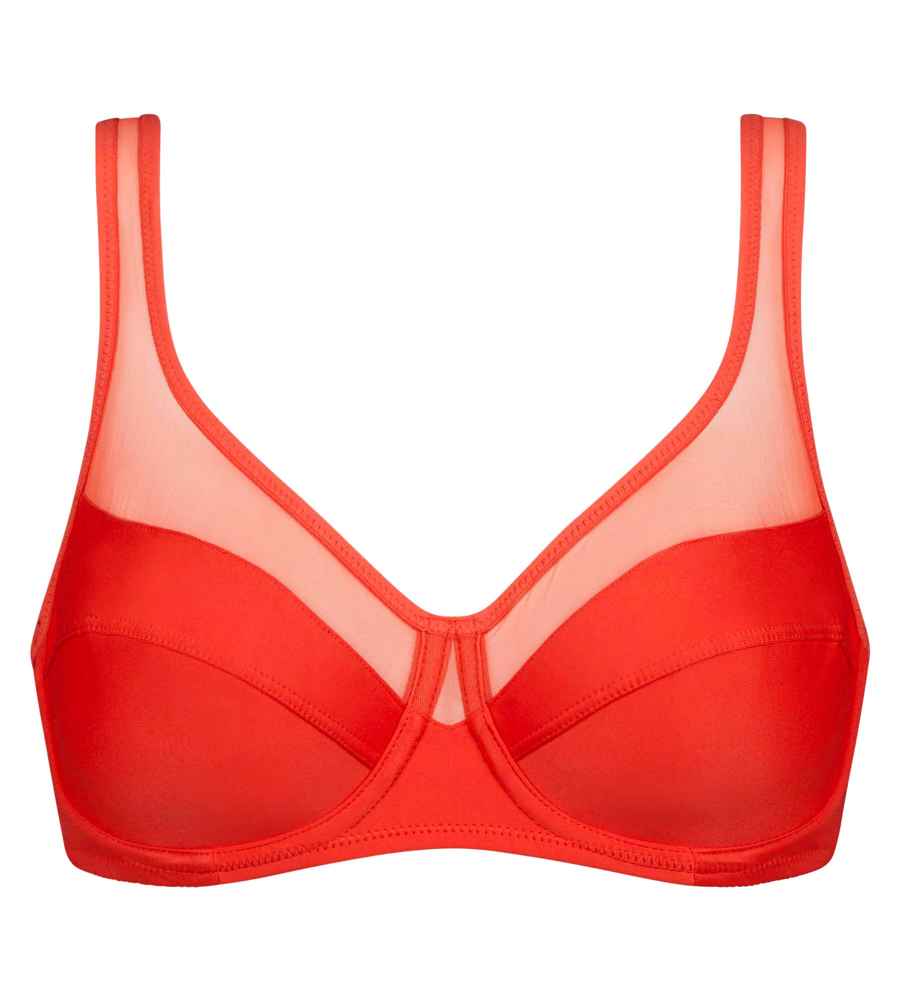 Adopt an effortlessly feminine style with the Dim Generous underwire full cup bra in Flame-red microfibre and tulle!
