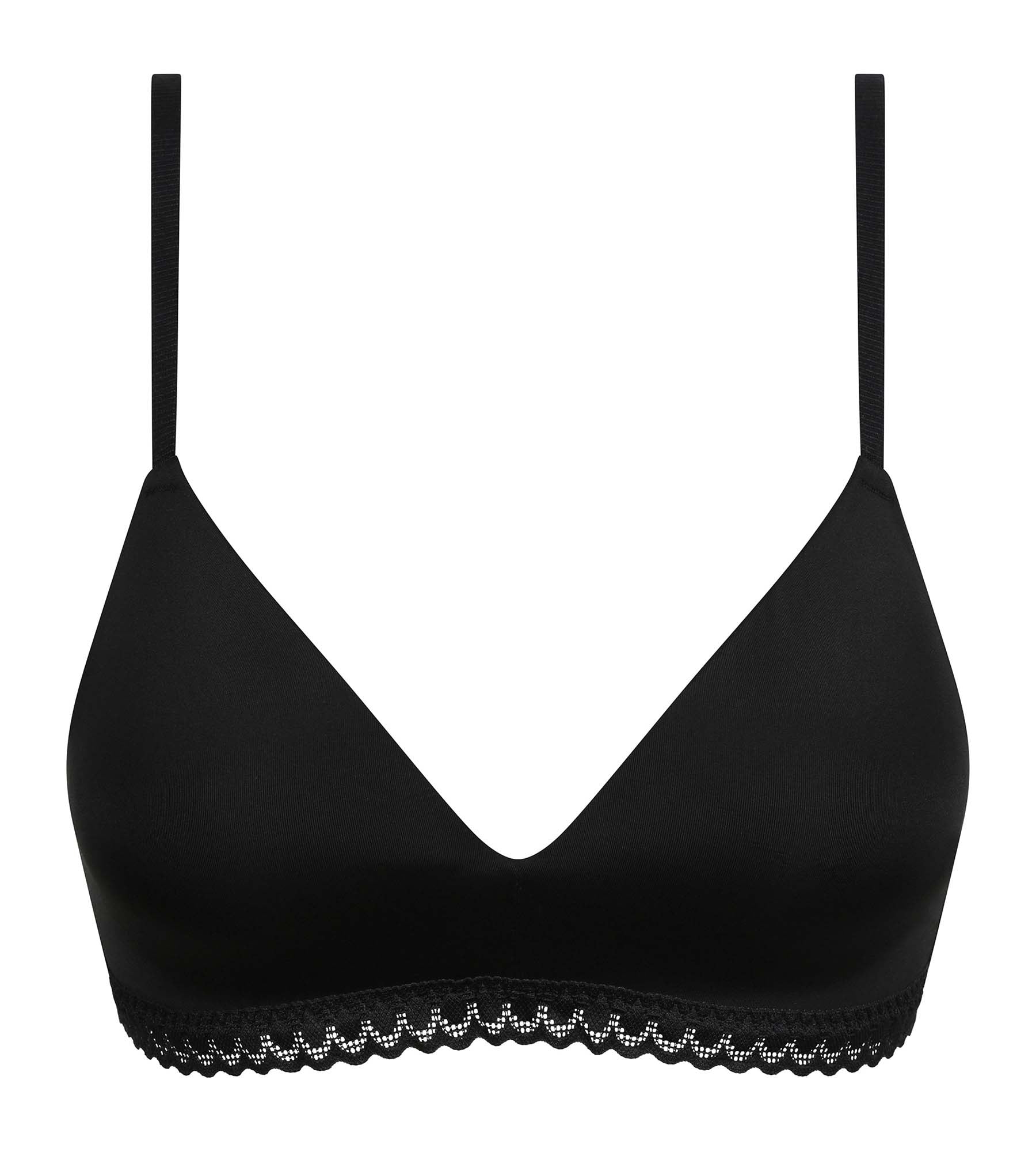 Made from fluid, supple microfiber and featuring progressive foams, the Daily Micro triangle bra combines comfort and support despite the absence of underwiring. With its V-neckline and ampliform cut, this Daily Micro women's bra envelops and draws the breasts together, for a natural curve. We love the delicate polka-dot lace braid, which adds a modern, feminine touch to this elegant black undergarment.