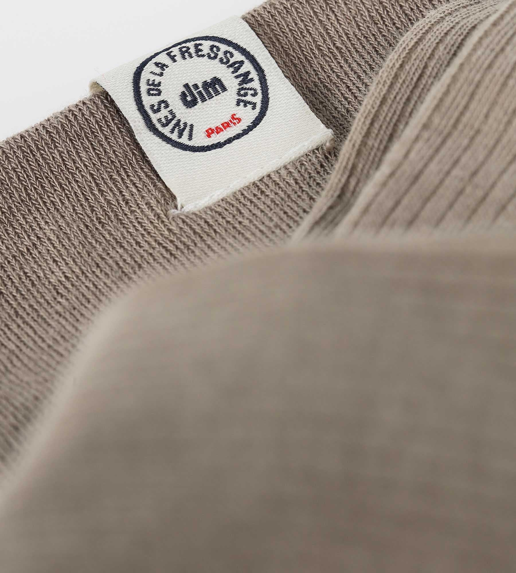 Designed for everyday wear, the Dim x Inès de La Fressange women's high socks focus on functional simplicity. Their ribbed cotton knit hugs the leg without discomfort and follows your movements naturally. The Fungi colour adds a soft, neutral hue to your outfits, perfect for a sober casual tee style. This model combines the practicality of cotton socks with the understated elegance of Inès de La Fressange, for a polished, effortless look.
