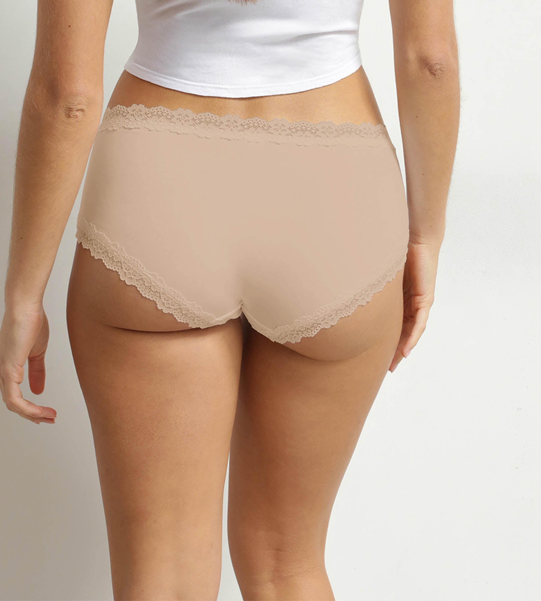 These women’s briefs are completely invisible thanks to their fine microfibre fabric that glides over the skin without leaving marks. The nude colour blends naturally under light-coloured or sheer clothing. The brief cut provides support without constriction, while the lace trim adds a feminine touch that remains discreet, even under tight-fitting clothing. An everyday essential that prioritises immediate comfort with a refined finish, for women’s lace boxer shorts that are as practical as they are elegant.