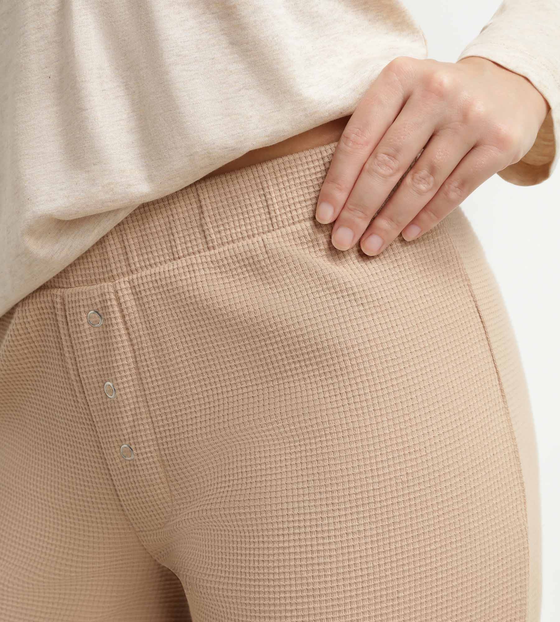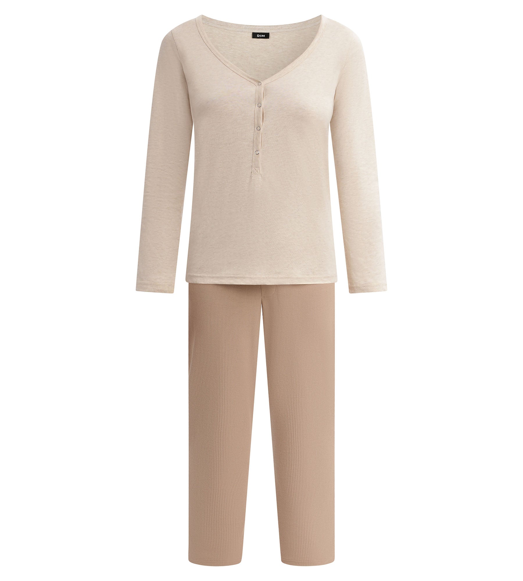 Perfect for quiet mornings and relaxing evenings, these Dim women’s pyjamas focus on chic simplicity. The beige jersey top adds brightness, while the taupe brown bottoms anchor the ensemble in a natural and contemporary palette. The Serafino cut with a V-neck and buttons gives a relaxed-chic look, while the straight, low-rise trousers remain comfortable without constricting. A colour combination designed to suit all your cocooning needs without sacrificing style. The Cosy Time collection offers timeless and easy-to-wear homewear basics!