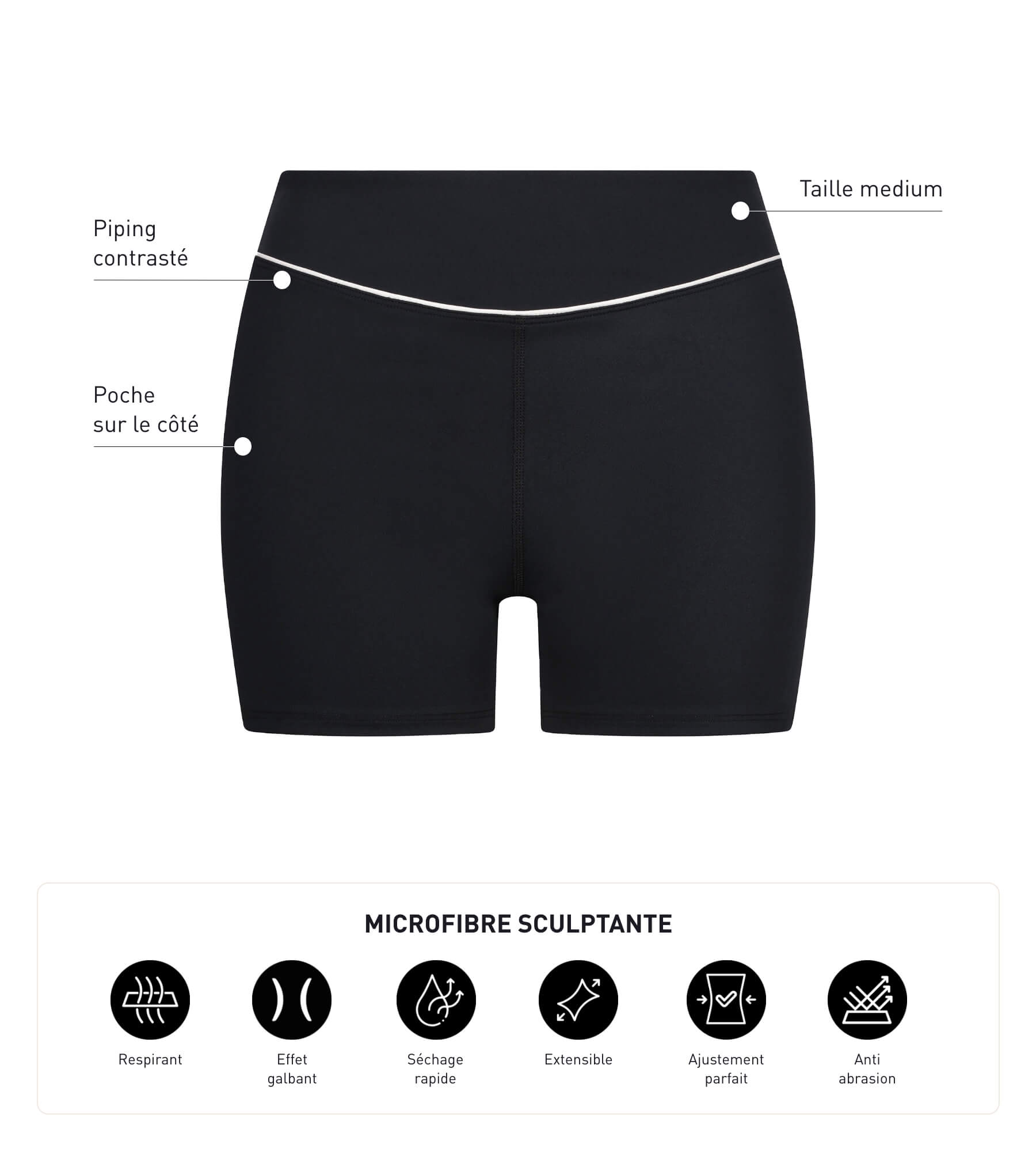 With its short, minimalist cut and seamless construction, the woman's shortyDim Move lets you move with complete freedom. With its dense microfibre fabric, this shorty gainant will shape and adjust naturally to your figure. Its mid-rise waistband with soft waistband wraps around your waist without constricting it. In black with white piping, your sports shorts are soberly tailored.