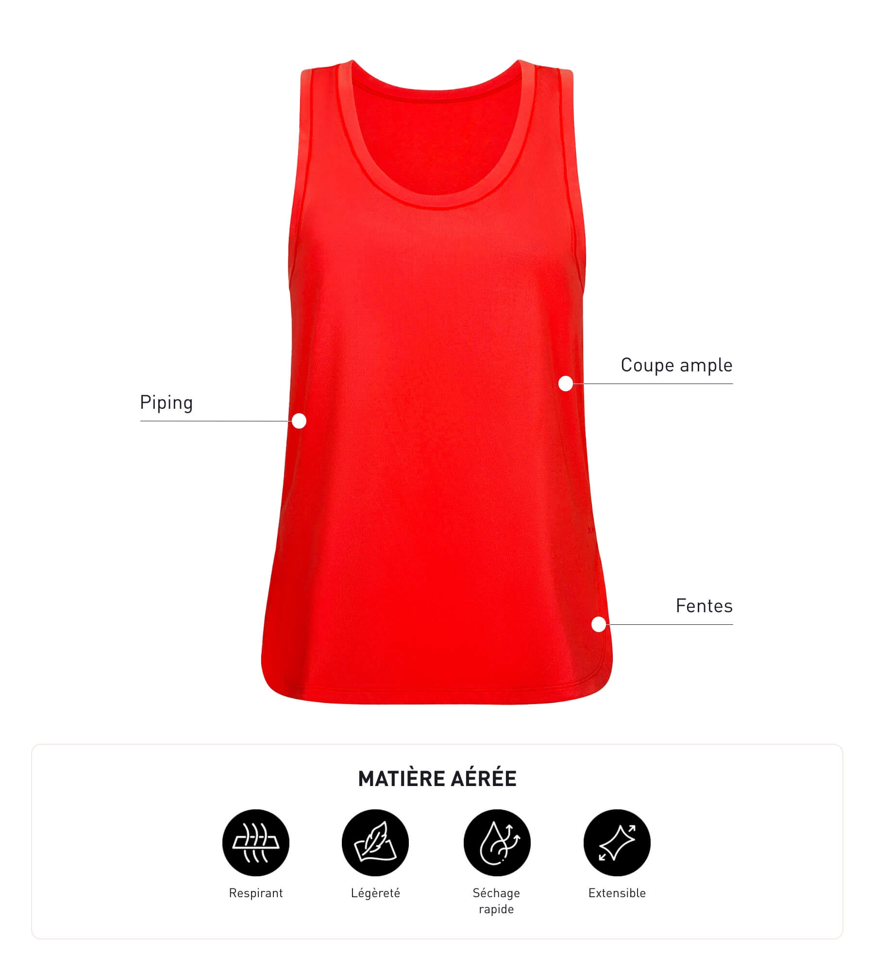 Designed for both sport and off-duty moments, this Dim Move women's sports tank top combines freedom of movement with a comfortable fit. Its fluid viscose fabric provides good ventilation during exercise, while reducing the feeling of wetness. The slightly longer cut provides good coverage and moves with you thanks to its side slits. The orange colour adds character to your sports or loungewear look, with a contrasting tail that makes it even more graphic.