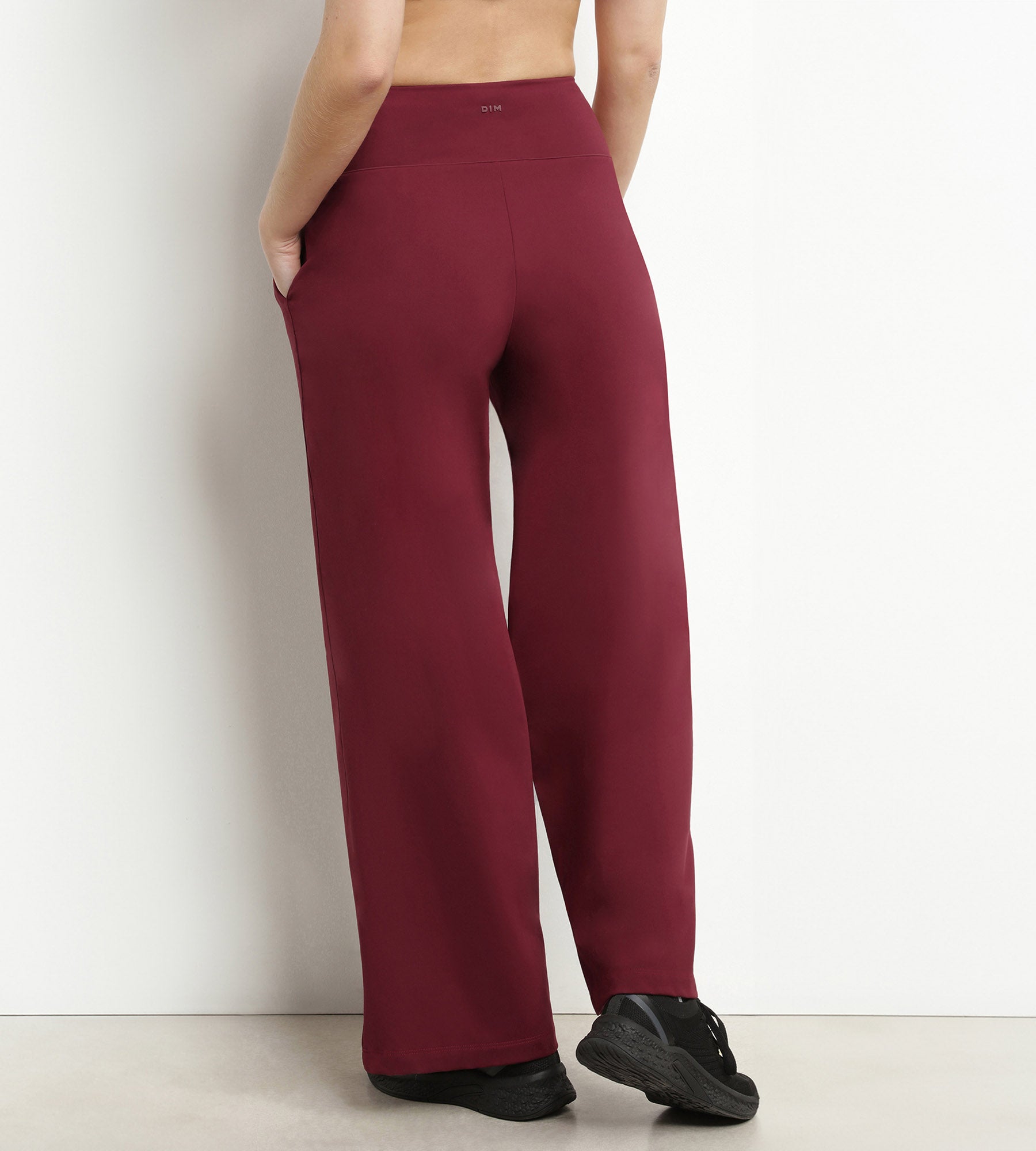 AWith their loose-fitting silhouette and stretch jersey fabric, the Dim Move women's sports trousers are a stylish accompaniment to all your sporting activities and moments of relaxation! Featuring a high, fold-over waistband and extra-wide legs, the Dim Move sports trousers give you total freedom of movement. We love their powerful Bordeaux colour and the black piping that emphasises the waist and sides of your trousers sportswear with great charisma.