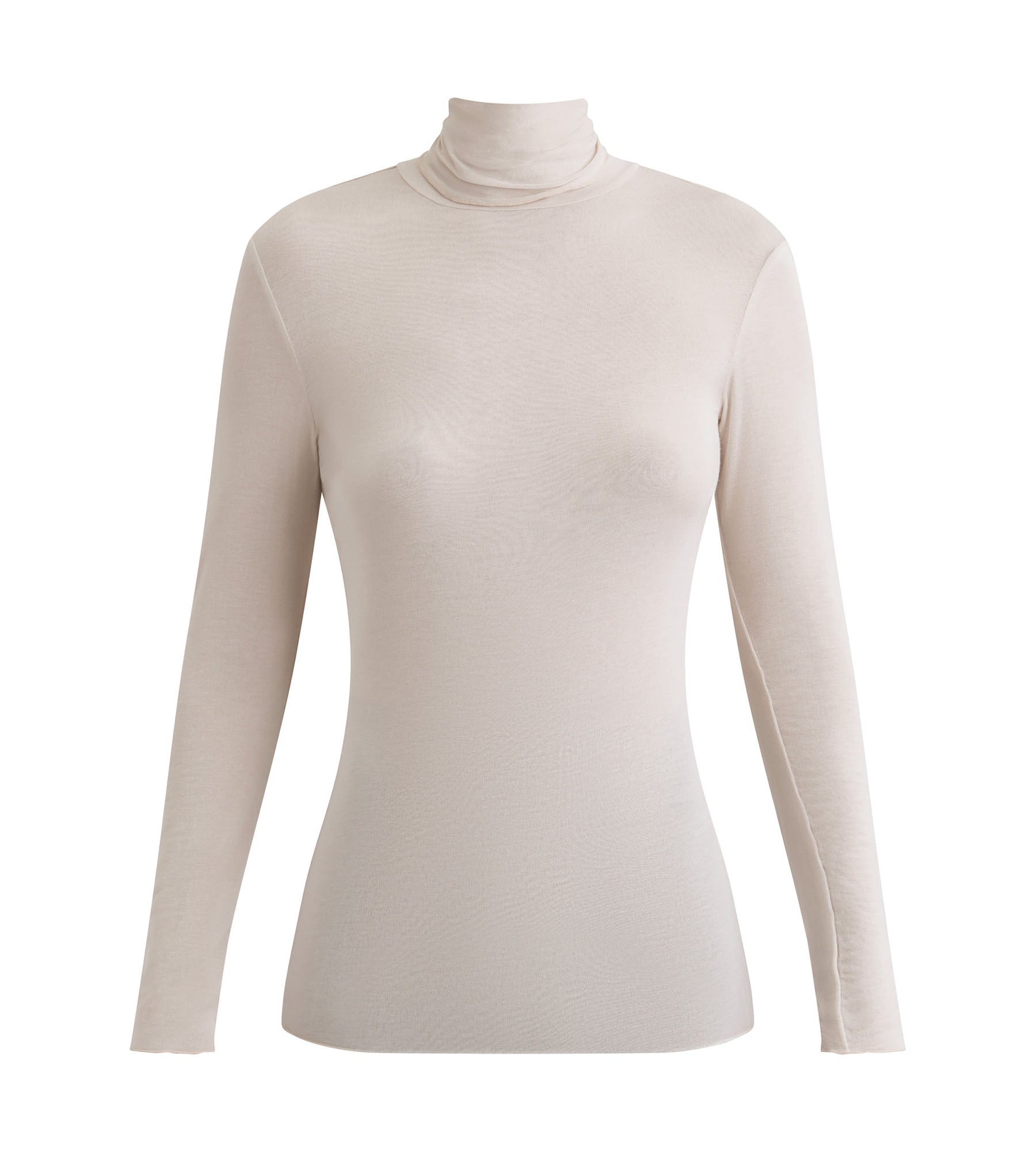 Combat the cold with style thanks to the Dim Thermal x Ines de la Fressange women's stand-up collar t-shirt in Beige Lavé fine knit.