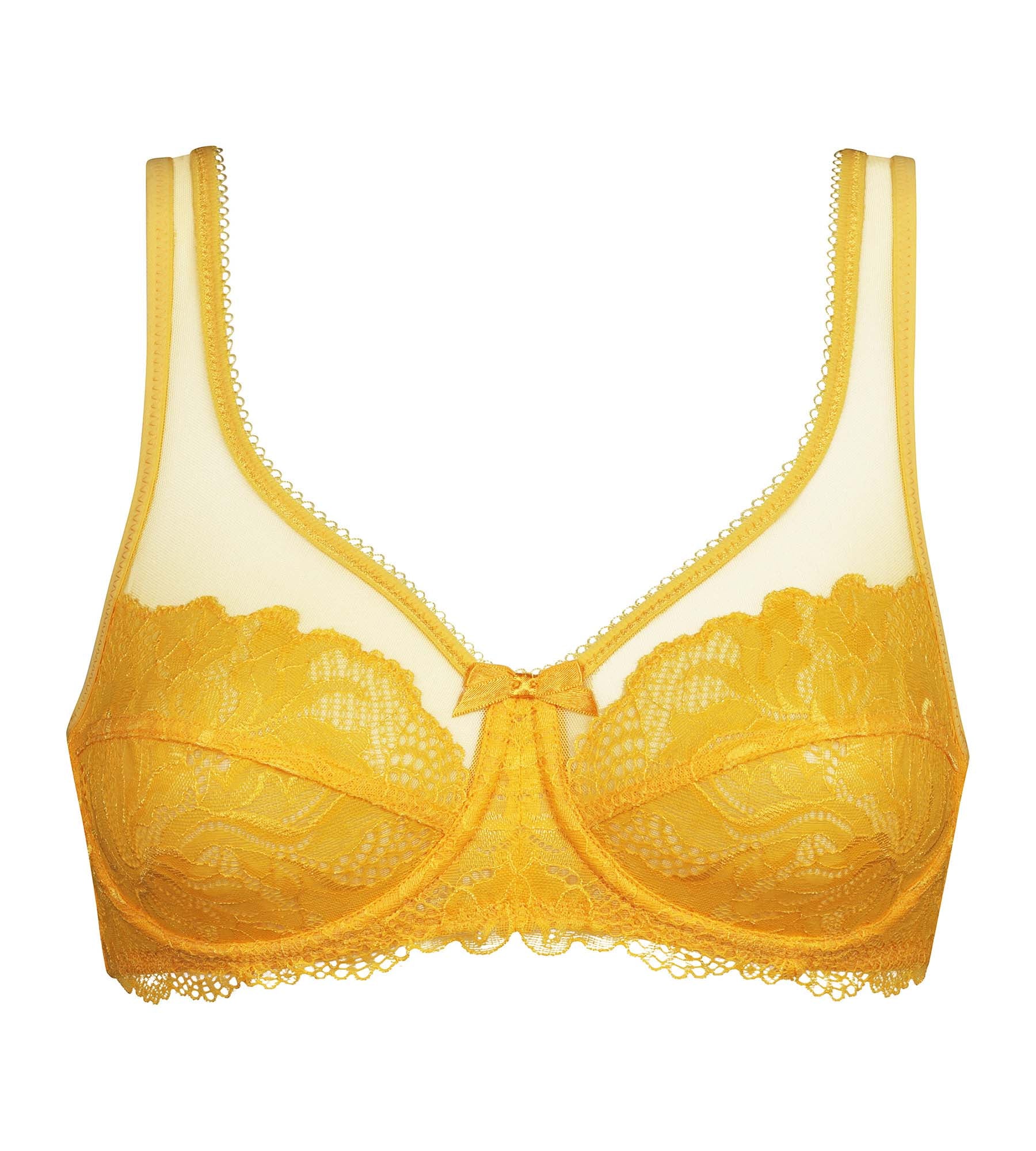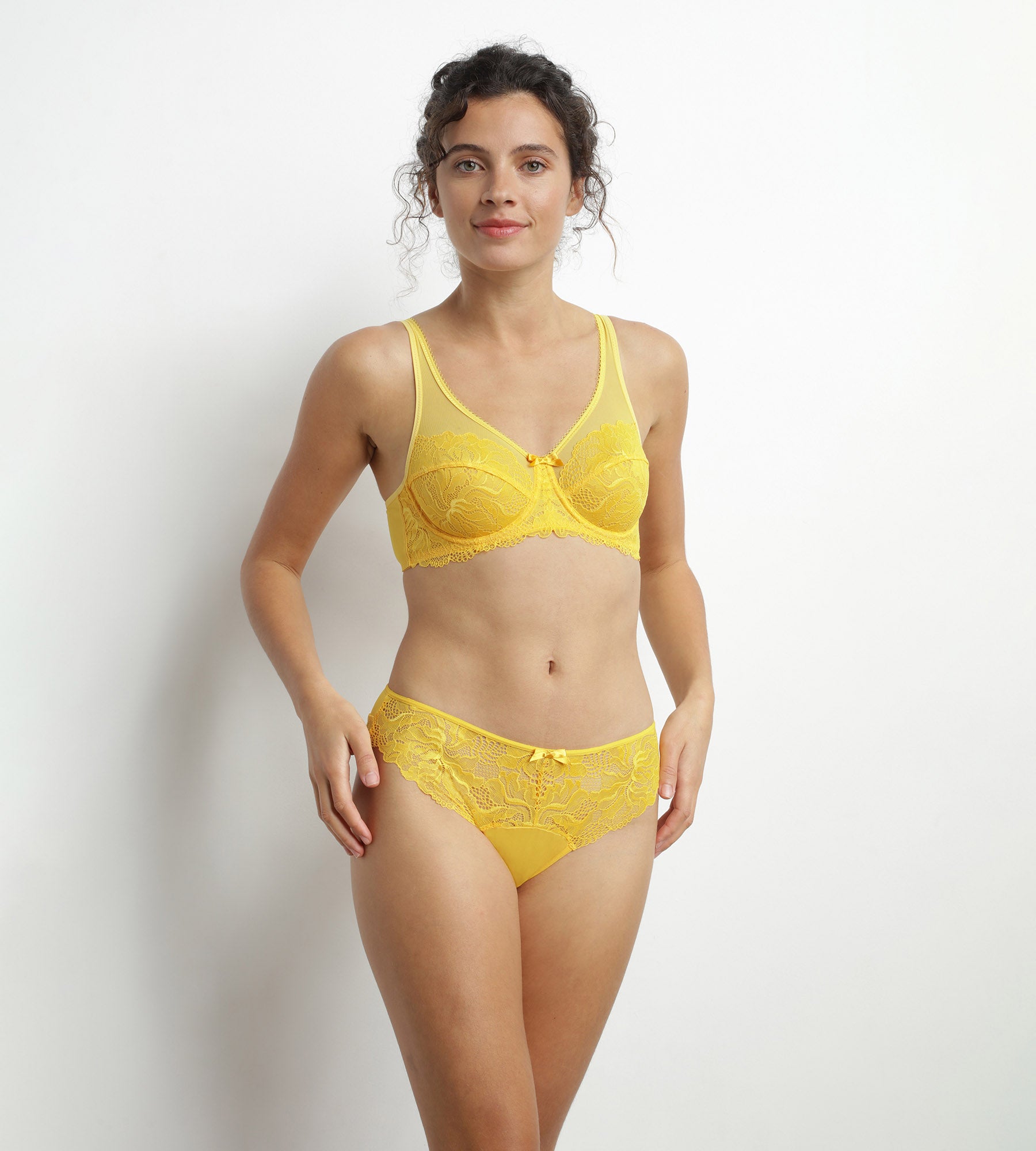 Succumb to the vibrant, feminine style of DIM's Generous Essentiel interlocking bra in Mirabelle Yellow lace!